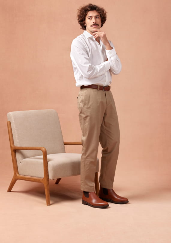Les chelsea boots se portent aussi bien avec un jean ajusté, un chino ou un pantalon en laine. L’idéal est un bas légèrement fuselé qui tombe juste au-dessus de la bottine pour bien la mettre en valeur.